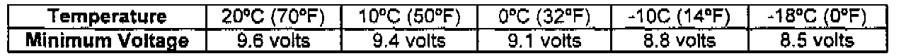 3. Battery temperature should be estimated by touch and also by the surrounding temperature it was exposed to during the few hours before testing. Select the nearest estimated temperature in the table above and determine the minimum voltage which must be maintained while the battery supplies a specified electrical load.