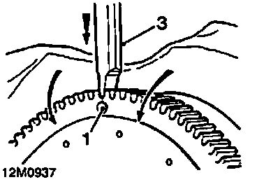 1. Drill a 9.5 mm (0.375 in) diameter hole axially at base of tooth and inner diameter of starter ring, sufficiently deep enough to weaken ring gear.