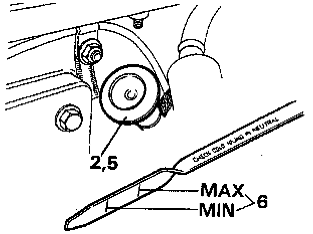 6. With "P" selected, start and run engine. Apply footbrake, move selector slowly to position "1" then back to "N". Check fluid level, this must be between the 2 level marks on dipstick.