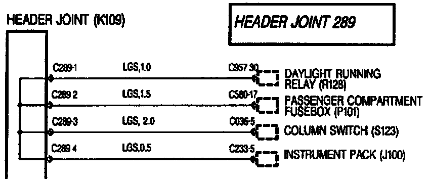 Header joints are identified by their corresponding connector number with a numbered suffix to indicate the pin-out detail of the wire, i.e. C289-1 identifies connector 289, pin number 1. Wire insulation color is identified in the normal way. Where wires have a predominant color with a secondary color stripe, the main stripe is identified first, i.e. LGS - Light Green with a Slate stripe.
