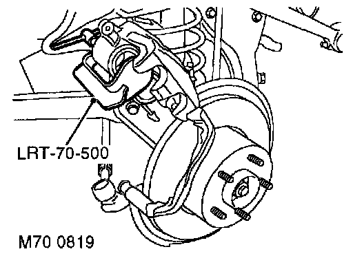 4. Using tool LRT-70-500, press caliper pistons fully into bores. Ensure that displaced fluid does not overflow from reservoir.