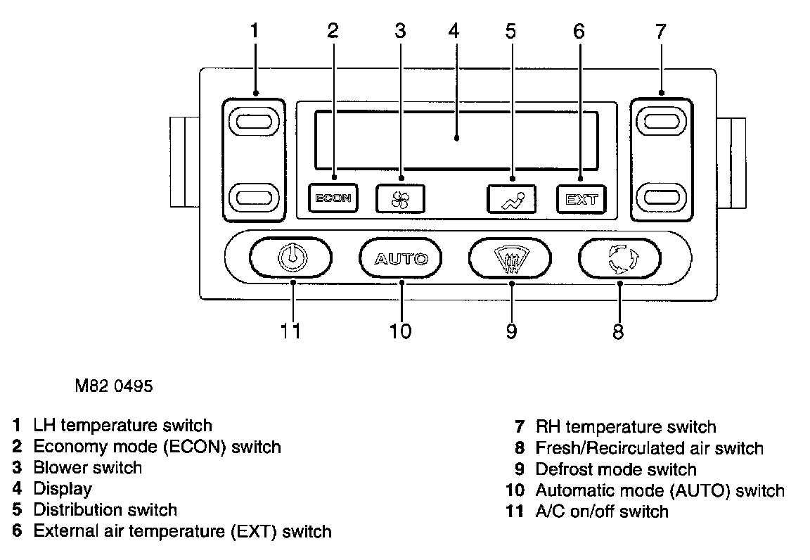 Economy mode (ECON) switch. Enabled only while the system is on. Provides manual on/off control of the refrigerant system compressor, to reduce fuel consumption when there is no requirement for cool or dehumidified air, e.g. when the ambient temperature is lower than the LH and RH temperature settings.