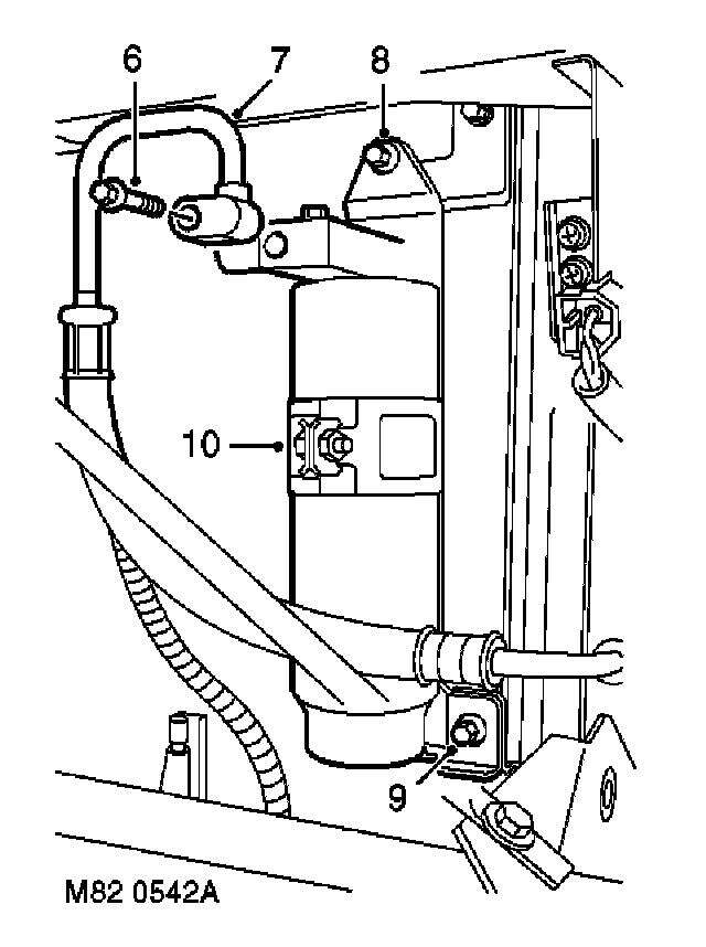 8. Remove bolt securing top of receiver drier mounting bracket to condenser.