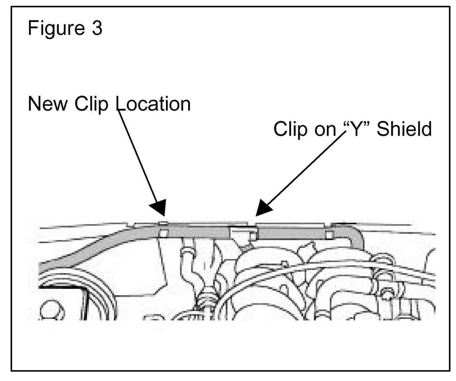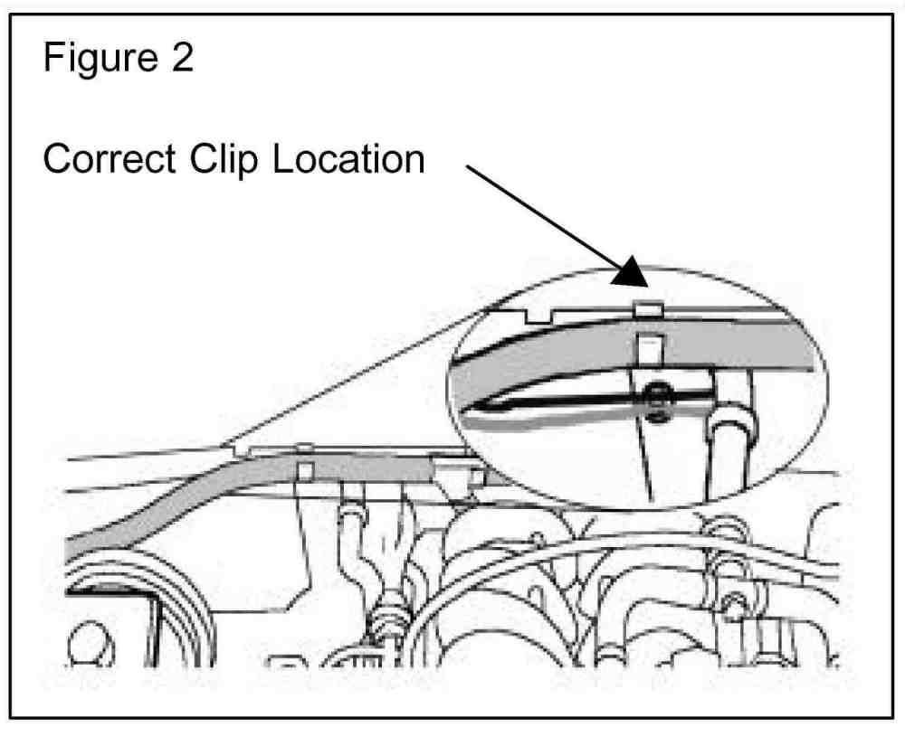 ^ Relocate the clip on the passenger (right) side of the vehicle to a location directly above the brake pipe clip. (Figure 2)