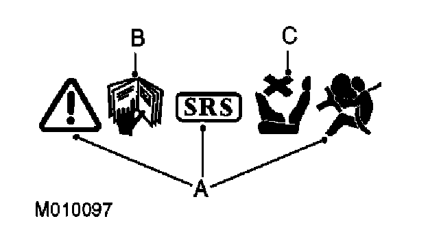 Warning symbols are displayed at various positions in the vehicle (either in a suitable prominent position such as driver and passenger side glass, or attached to the component itself) to indicate SRS items which must be treated with particular care. Exact positions of SRS warning labels may vary dependent on legislation and market trends.