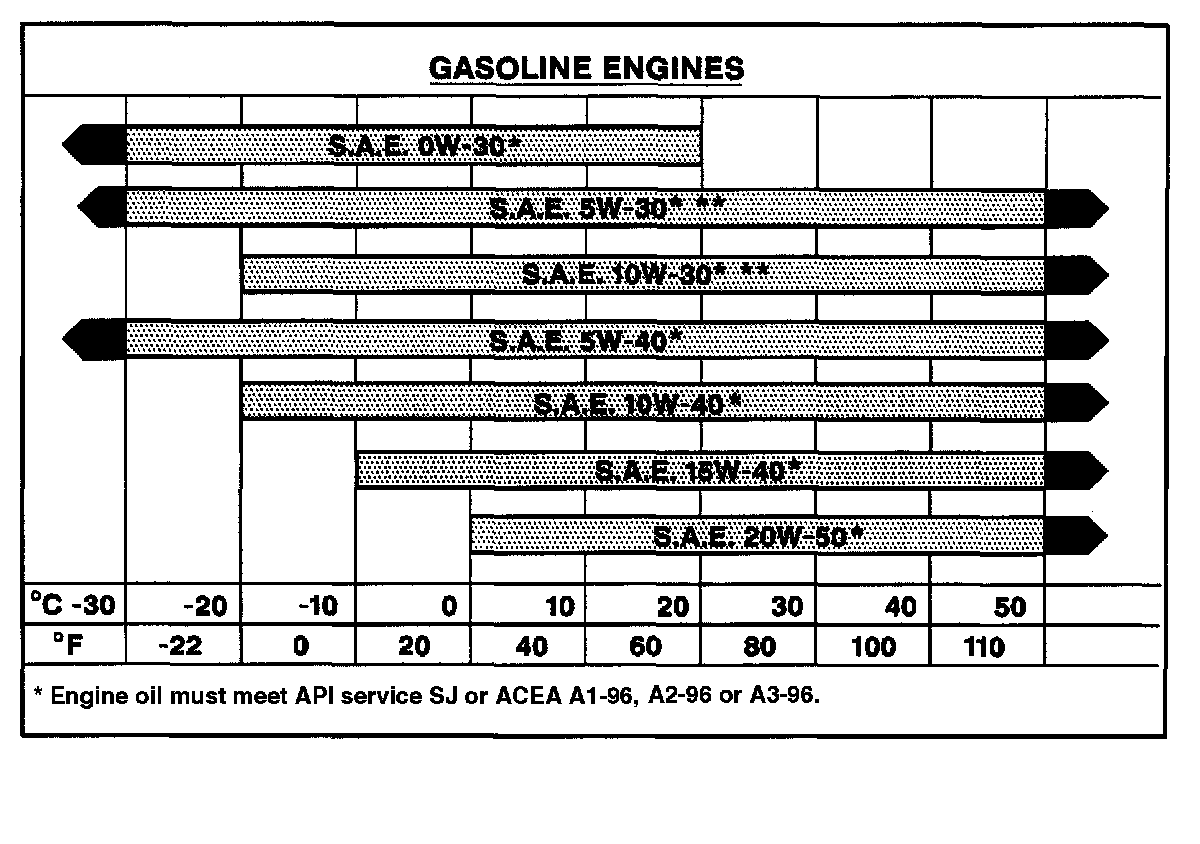 Use a 5W/30, 5W/40, 5W/50, 10W/30, 10W/40, 10W/50 or 10W/60 oil meeting ACEA A1 or A2, having a viscosity band suitable for the temperature range of your locality. See chart below.