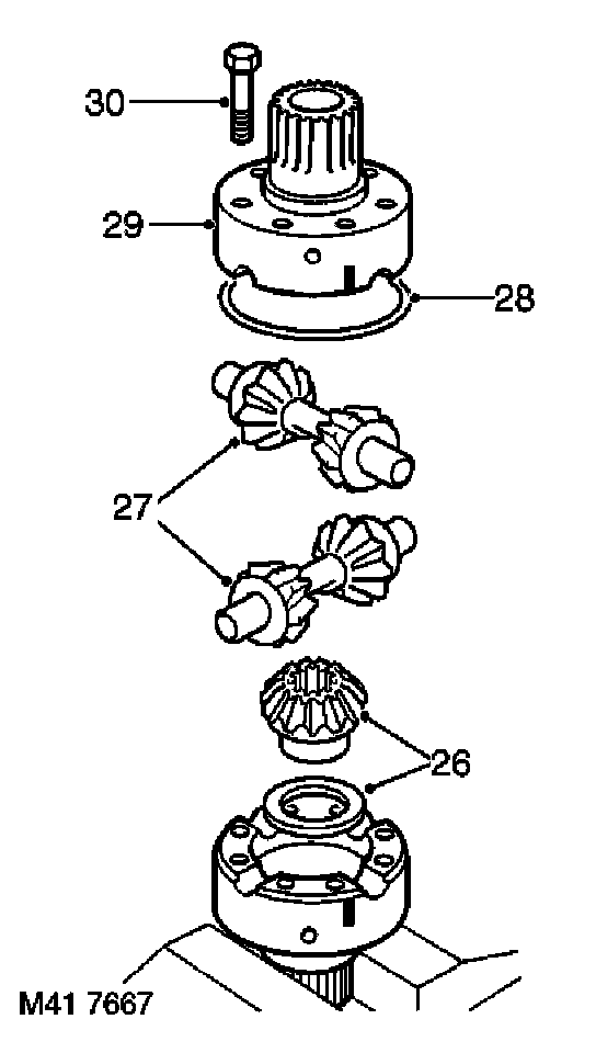 27. Fit planet gears, cross shafts and dished thrust washers to rear half of carrier. Ensure that cross shafts are fitted correctly. Do not fit the sun gear into the rear half carrier at this stage.