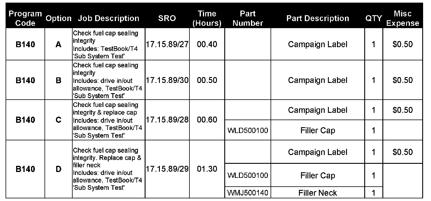 Any evaporative leaks detected other than the fuel filler cap or fuel filler neck, are to be carried out as a separate Warranty Claim and are NOT part of this Service Action.
