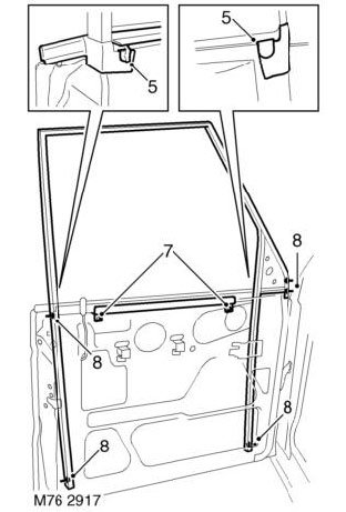2. Position frame to door and tighten bolts securing front door frame to 10 Nm (7 lbf.ft) and bolts securing rear door frame to 22 Nm (16 lbf.ft).