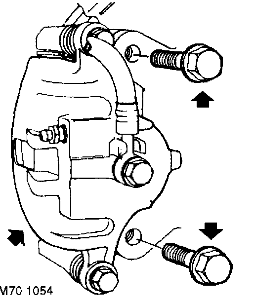 7. Remove 2 bolts securing brake caliper to hub. Release caliper from hub and tie aside.