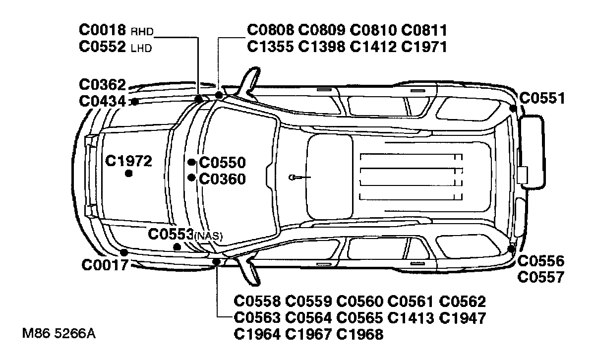 The following illustration indicates the general position of each earth point and header on the vehicle. Refer to the Connector for more information.