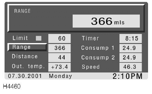 Range is the distance which the vehicle should cover on the remaining fuel in the tank. It is displayed and calculated on the assumption that the average fuel consumption will be maintained.