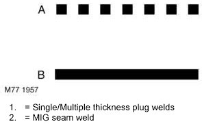 - MIG plug welds must be used in repair joints where there is no access for a resistance spot welder. To replace each production spot weld, an 8 mm (0.314) approx hole must be drilled and/or punched, and a MIG plug weld then made in its place. The number of plug welds must match exactly the number of spot welds which have been removed;