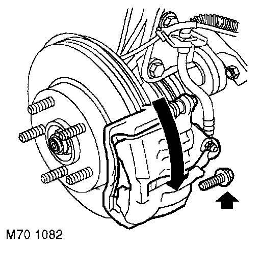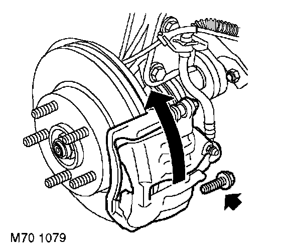 3. Remove lower guide pin bolt from caliper and discard bolt. Pivot caliper housing upwards.