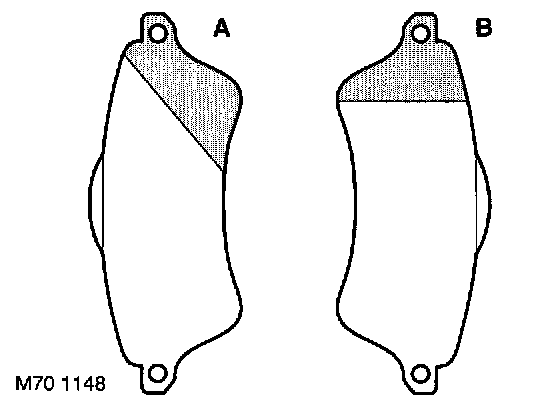 NOTE: The leading edge of the pads have chamfers on them, the chamfers are asymmetric. It is imperative that the pads are correctly fitted. Pad Win illustration must be fitted to the inboard side of the caliper. Pad 'B' must be fitted to the outboard side of the caliper. Illustration shows a RH pair of pads.