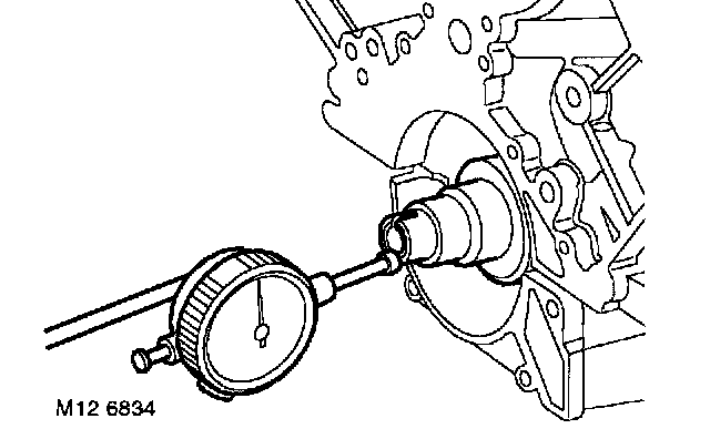 14. Position DTI gauge probe onto end of crankshaft as illustrated, push crankshaft away from DTI, zero DTI gauge, push crankshaft in the opposite direction and note reading on gauge.