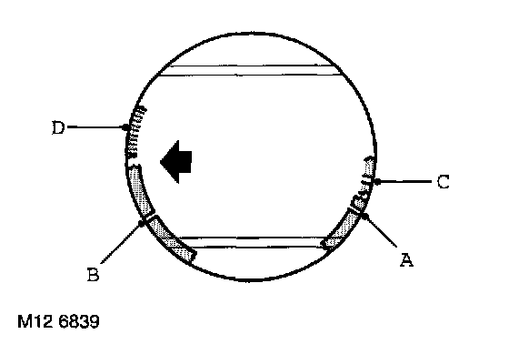 31. Ensure rings are free to rotate, position compression ring gaps A and B at 120° to each other and away from thrust side. Position oil control ring gap C and spring gap D at 30° on opposite side of gudgeon pin axis