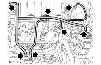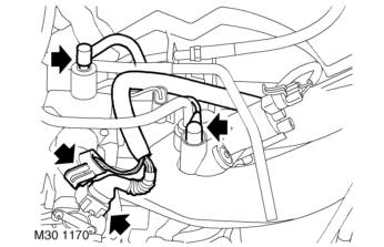 29. Release 2 clips securing RH plug top coil harness to inlet manifold chamber support brackets.