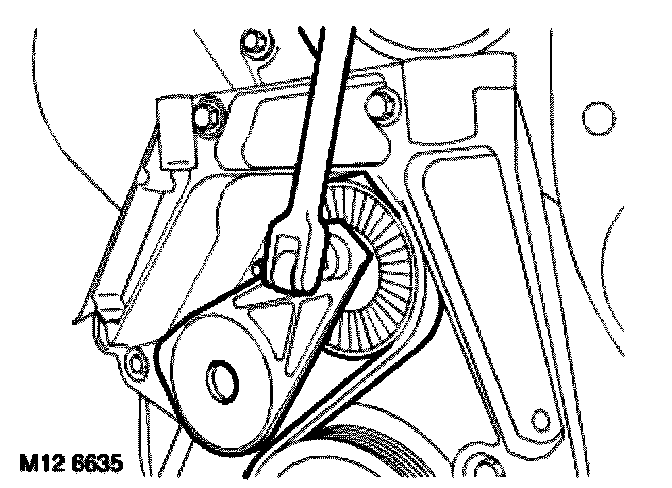 16. Using a 3/8 inch square drive socket bar, raise ancillary drive belt tensioner and fit drive belt to pulleys.