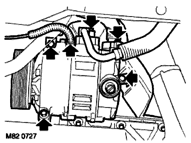7. Remove 2 bolts securing high and low pressure pipes to compressor. Release pipes from compressor, remove and discard 'O' rings.