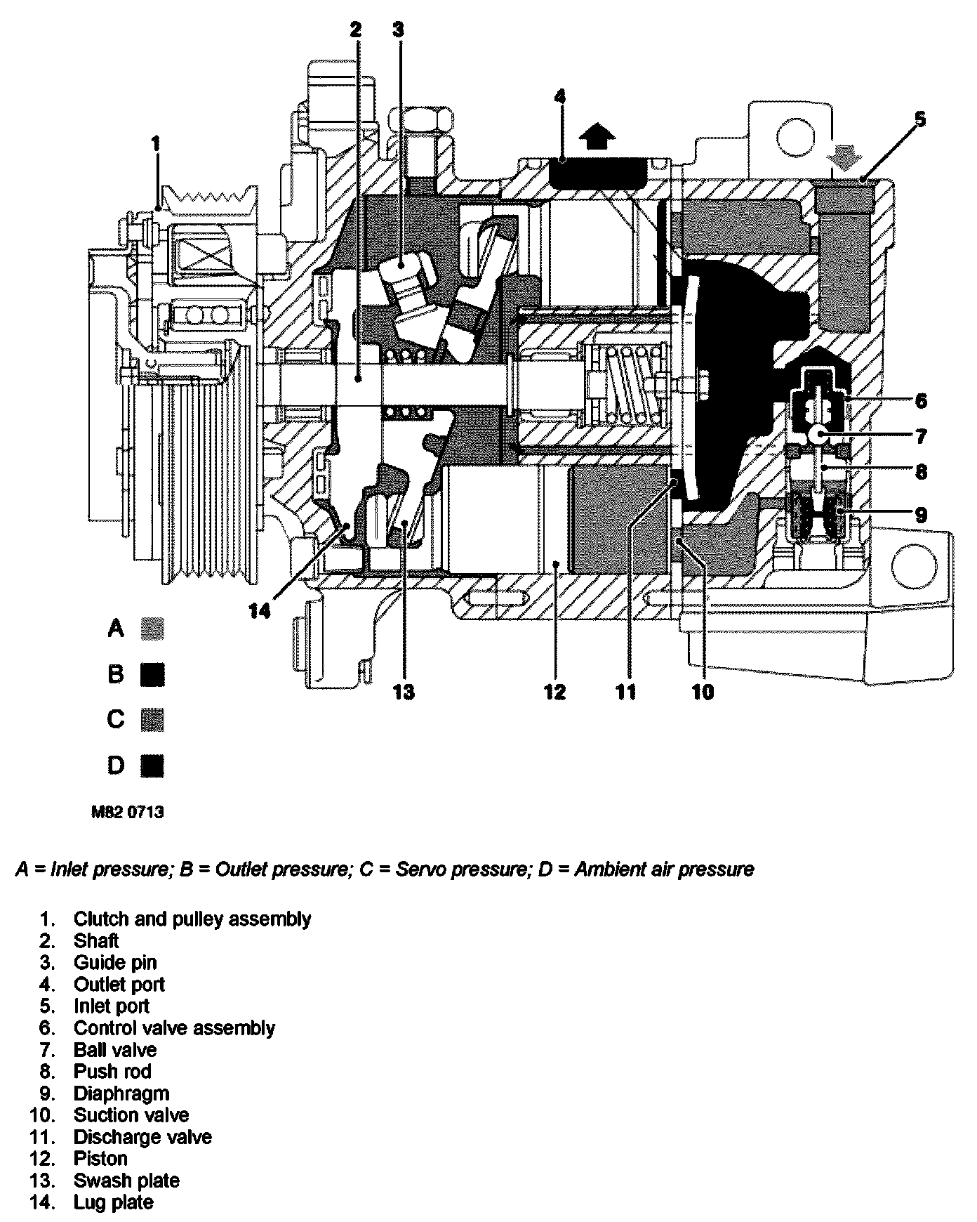 The control valve regulates the servo pressure in the swash plate chamber as a function of inlet pressure, so that the flow rate of the compressor matches the thermal load at the evaporator, i.e. the more cooling effort that is required in the cabin of the vehicle, corresponds to a higher thermal load and flow rate. Servo pressure varies between inlet pressure and inlet pressure + 1 bar (14.5 sq.lbf.in).