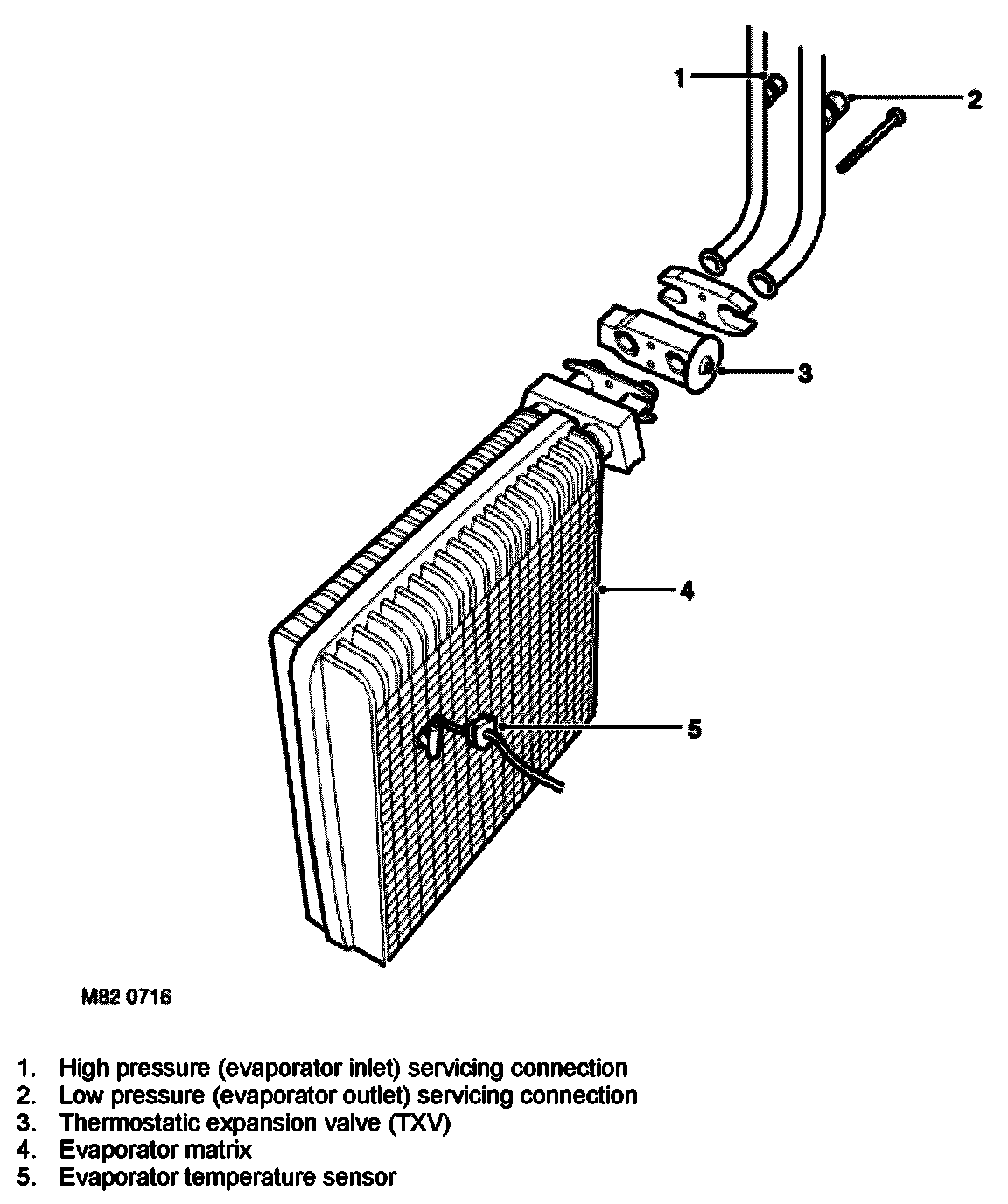 The sub-cooled liquid refrigerant passes from the outlet of the condenser through a pipe to a thermostatic expansion valve (TXV) situated at the engine compartment bulkhead. The TXV connects to the evaporator unit mounted inside the air inlet and blower motor casing in the vehicle cabin.