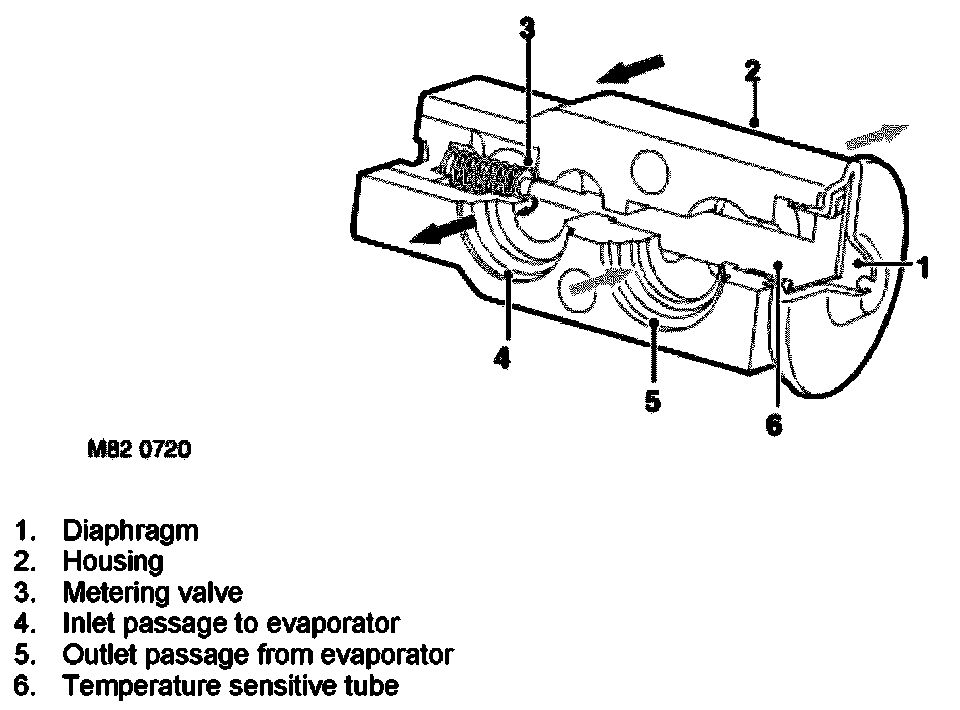 The thermostatic expansion valve is attached to the inlet and outlet ports of the evaporator, in the cooling unit behind the passenger's side of the fascia. The valve is the parallel charge type, consisting of an aluminium housing containing inlet and outlet passages. A ball and spring metering valve is installed in the inlet passage and a temperature sensor is installed in the outlet passage. The temperature sensor consists of a push rod connected to a diaphragm. The bottom end of the push rod acts on the ball of the metering valve. Pressure on top of the diaphragm is controlled by evaporator outlet temperature conducted through the push rod. The bottom of the diaphragm senses evaporator outlet pressure via internal passages.