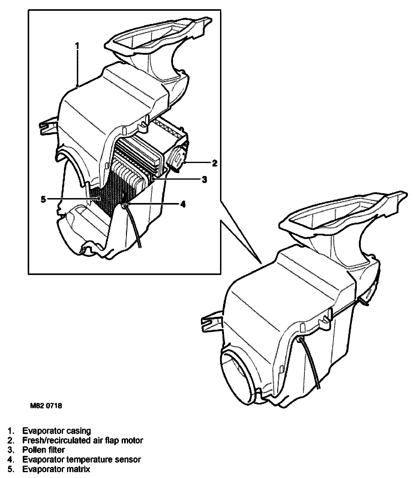 A control flap, operated by a recirculated air motor, opens and closes the fresh and recirculated air inlets. On the downstream side of the evaporator, the casing is lined with polystyrene insulation.