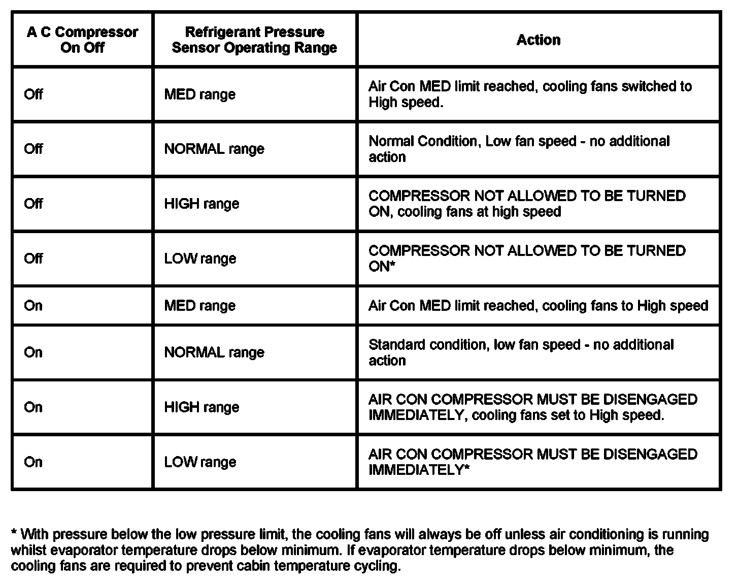 The Engine Control Module (ECM) controls the compressor and cooling fan operation in response to signals received from the refrigerant pressure sensor, evaporator temperature sensor and engine coolant temperature sensor, either directly or on the CAN Bus from the instrument pack. The refrigerant pressure can be low, medium or high, the system operating characteristics applicable for each condition is shown in the following table:
