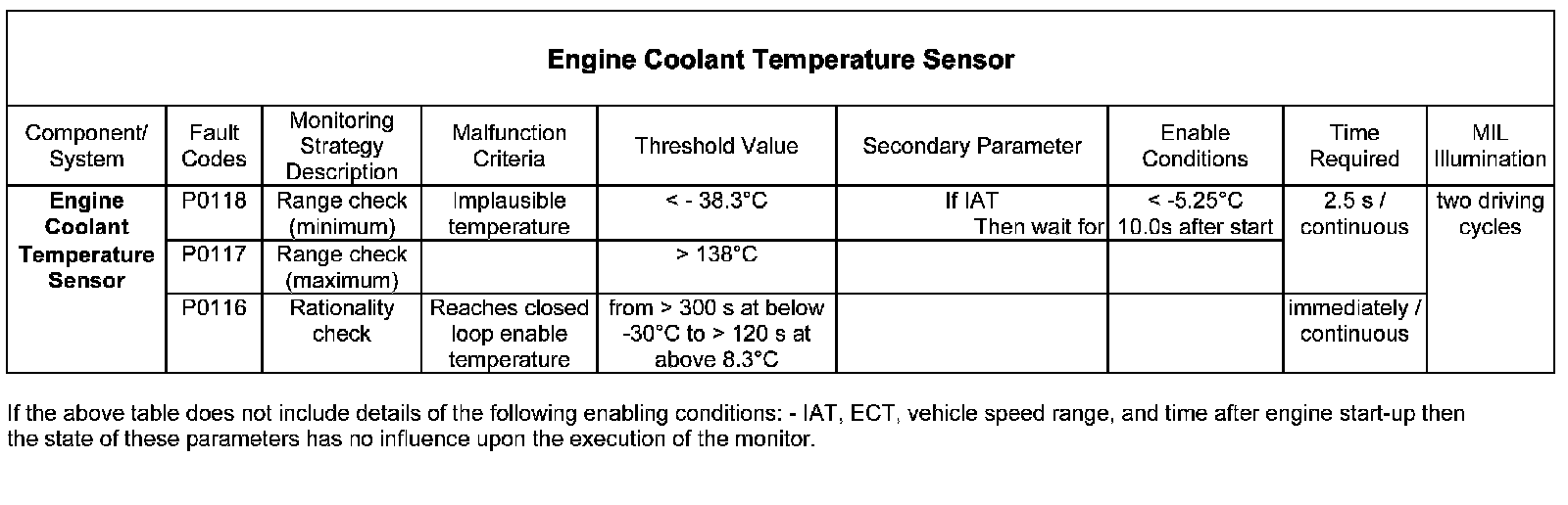 A fault condition is recognised if the ECT exceeds a minimum or maximum threshold, or the closed loop enable temperature has not been achieved within a temperature dependant time threshold.