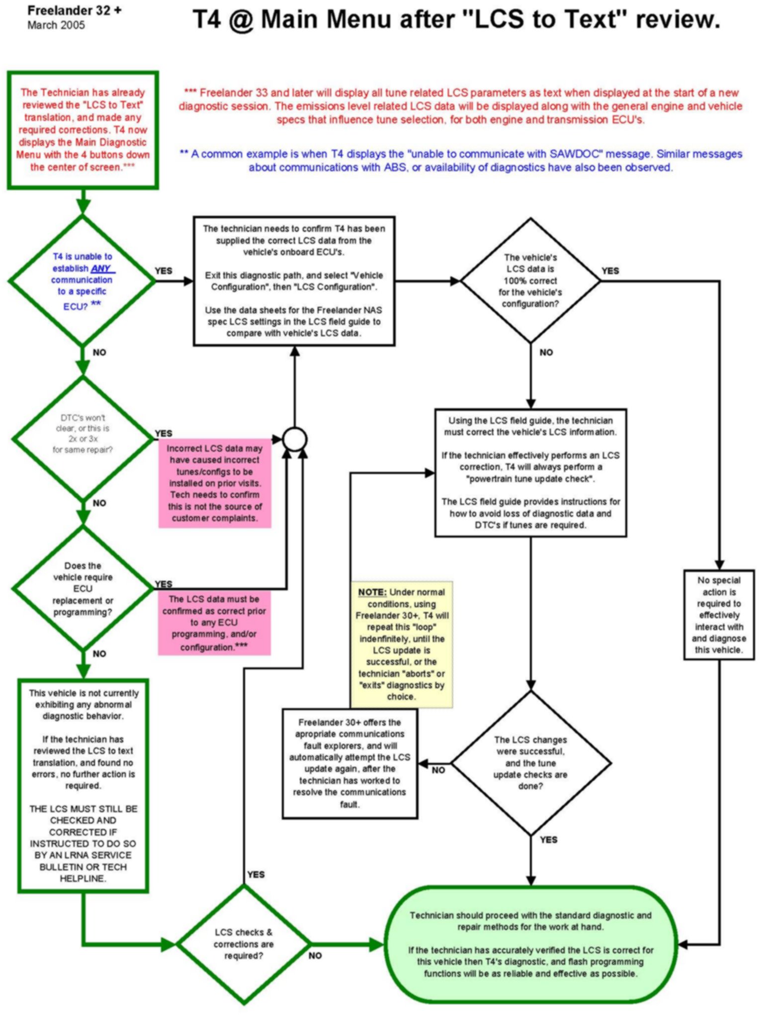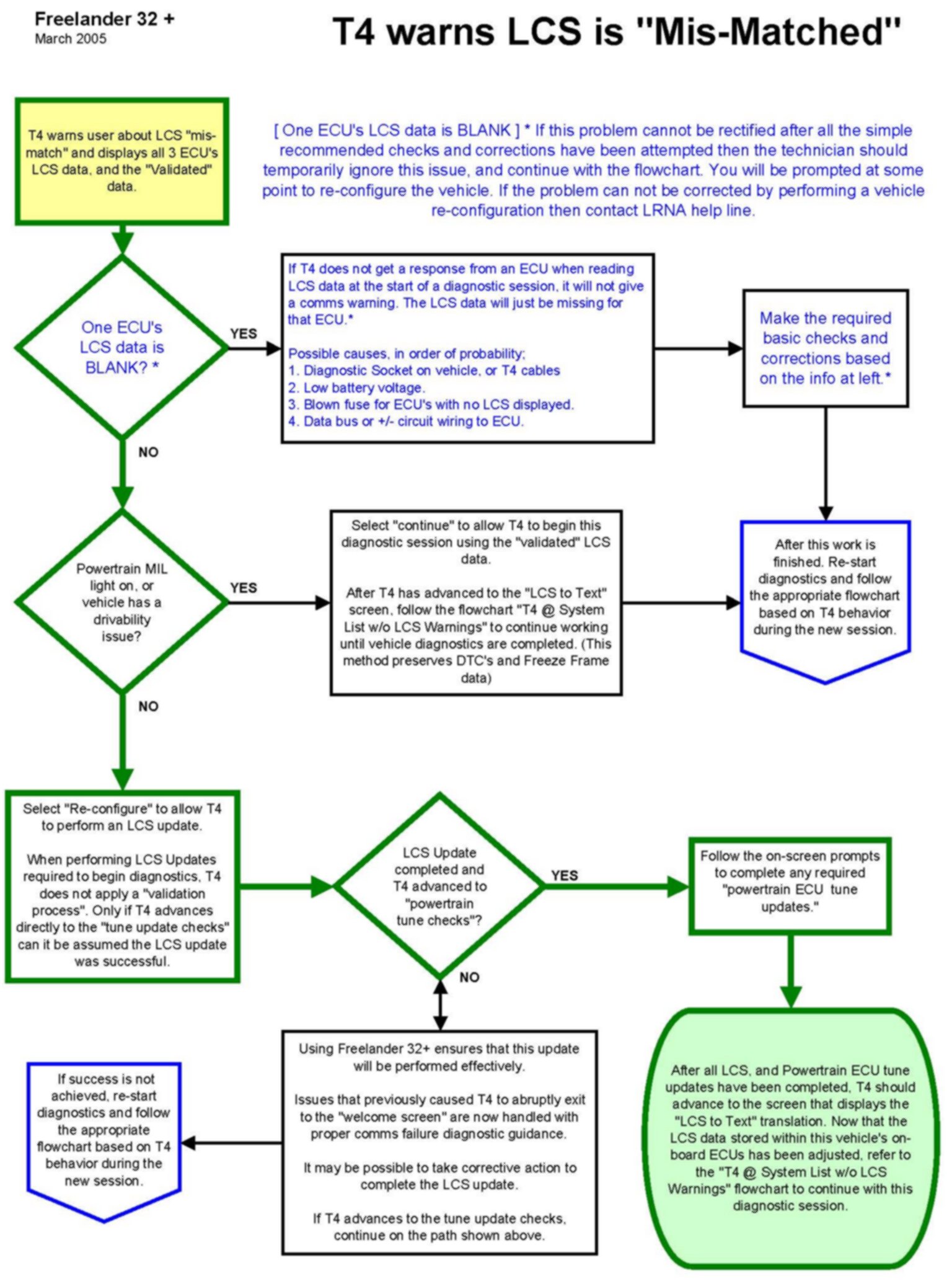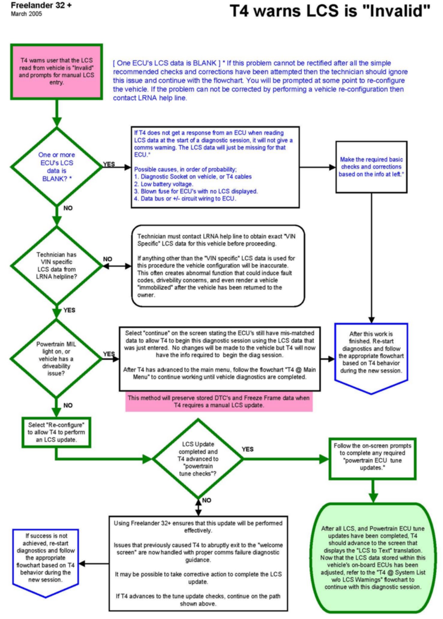 These flowcharts should be used when troubleshooting and/or giving technicians assistance when using "Freelander 32+" in T4. Locate the proper flowchart based on T4 behavior at the start of the current diagnostic session. See flowchart titles to match with T4 behavior.