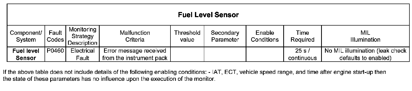This input is used as part of the EVAP detection system. The EVAP system diagnostic defaults to enabled if a fuel level sensor fault is detected. If a fault is detected by the ECM if an error message is received from the instrument pack.