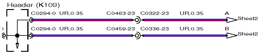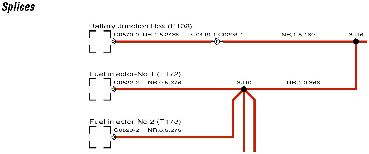 The wire length (in millimeters) is displayed after the color and cross sectional area; for example, SR,0.35,480. In this example, the figure, 480 indicates the approximate position of the harness splice is 480 mm from connector C2335.