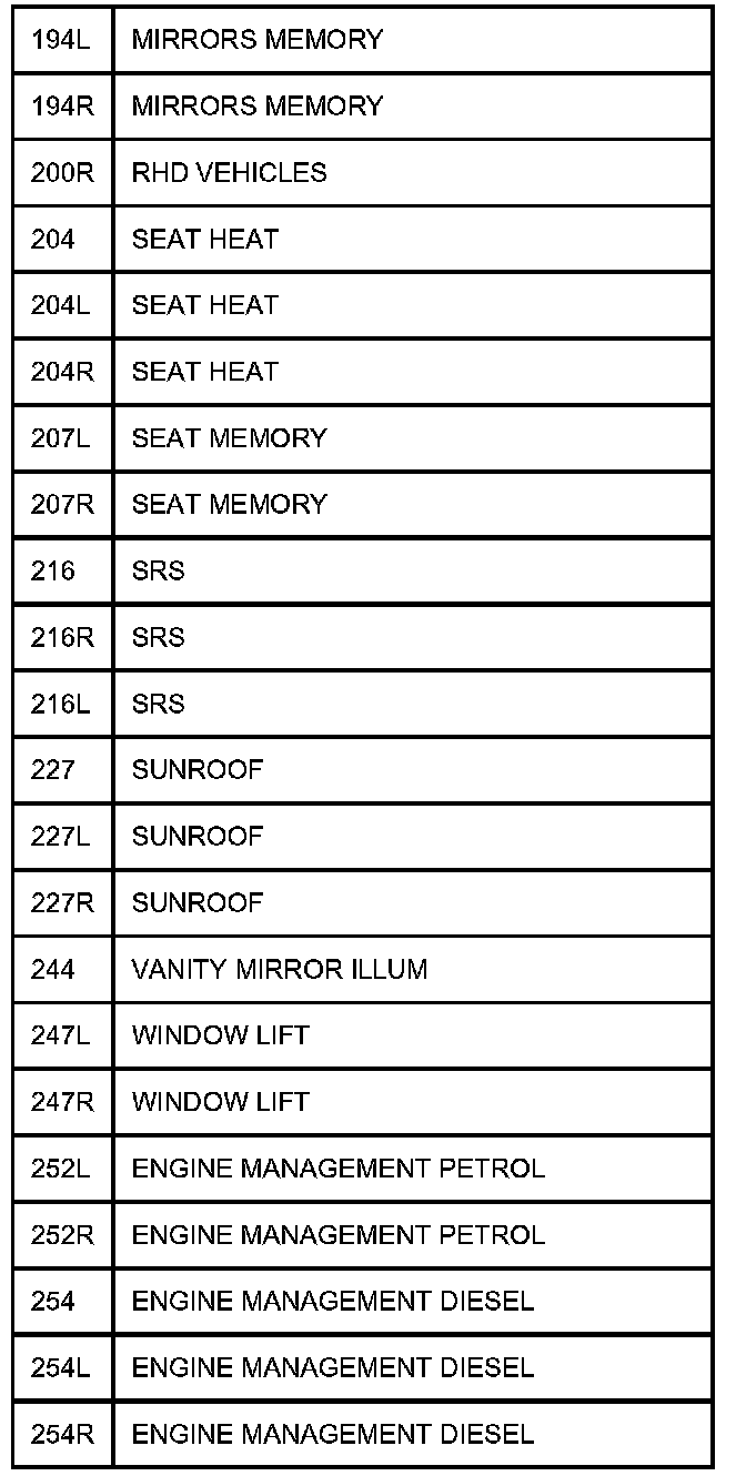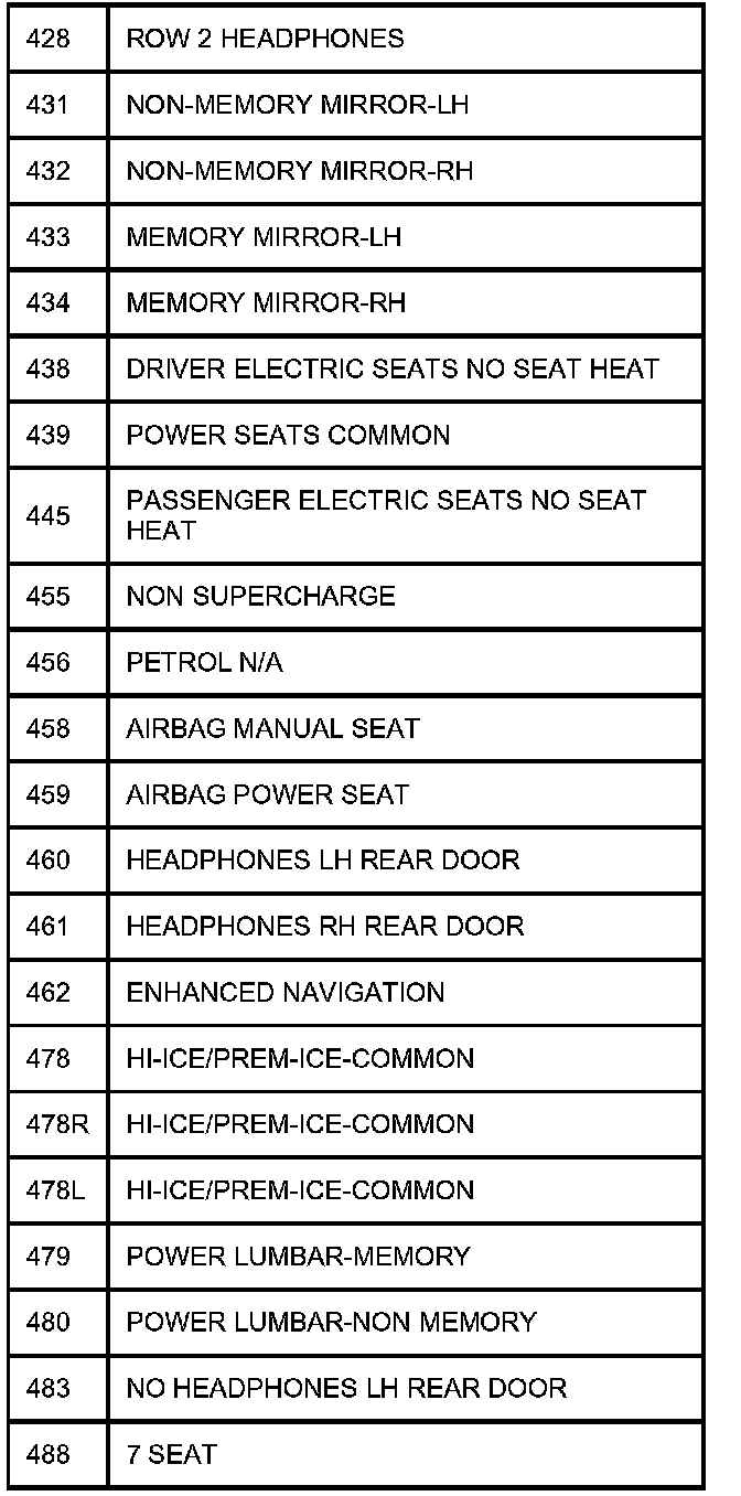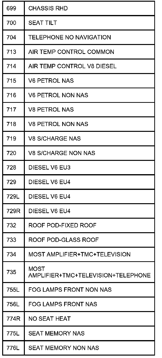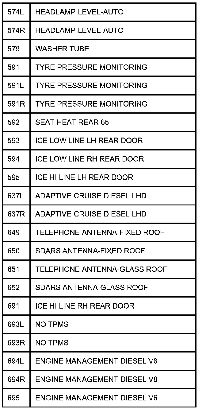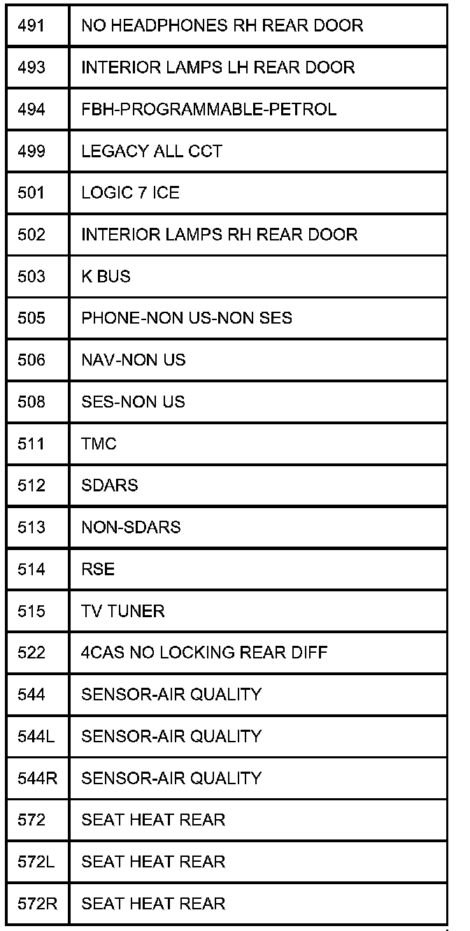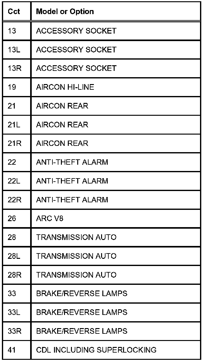 TABLE OF CIRCUIT OPTION CODESThe following table contains a list of circuit (Cct) reference numbers against a description of the applicable model or option. This information should be used in conjunction with the connector pin-out tables to determine the wire configuration of the vehicle under test.