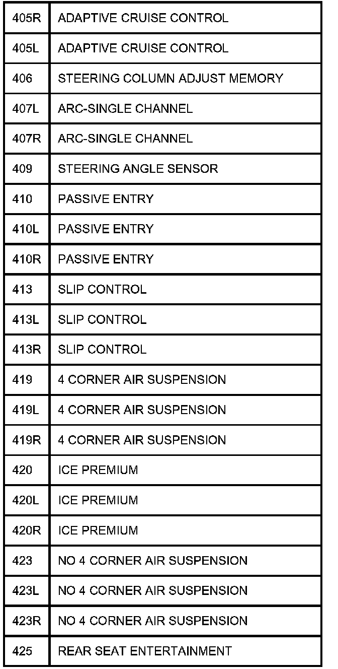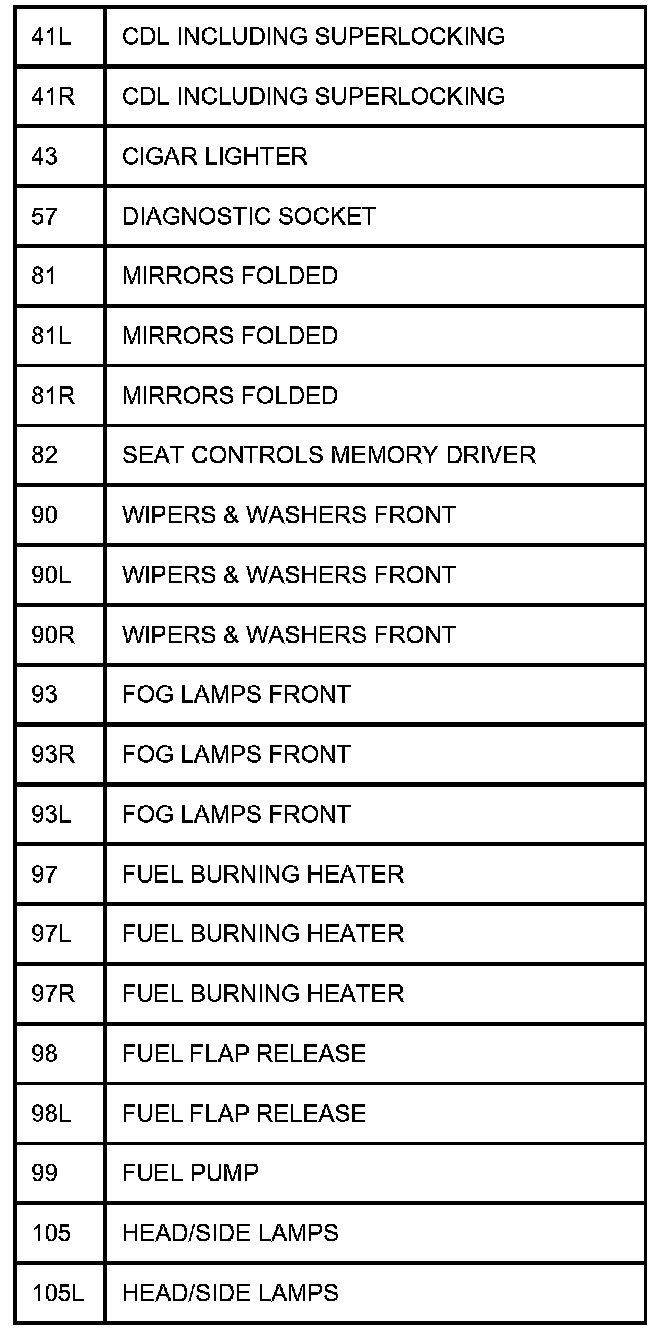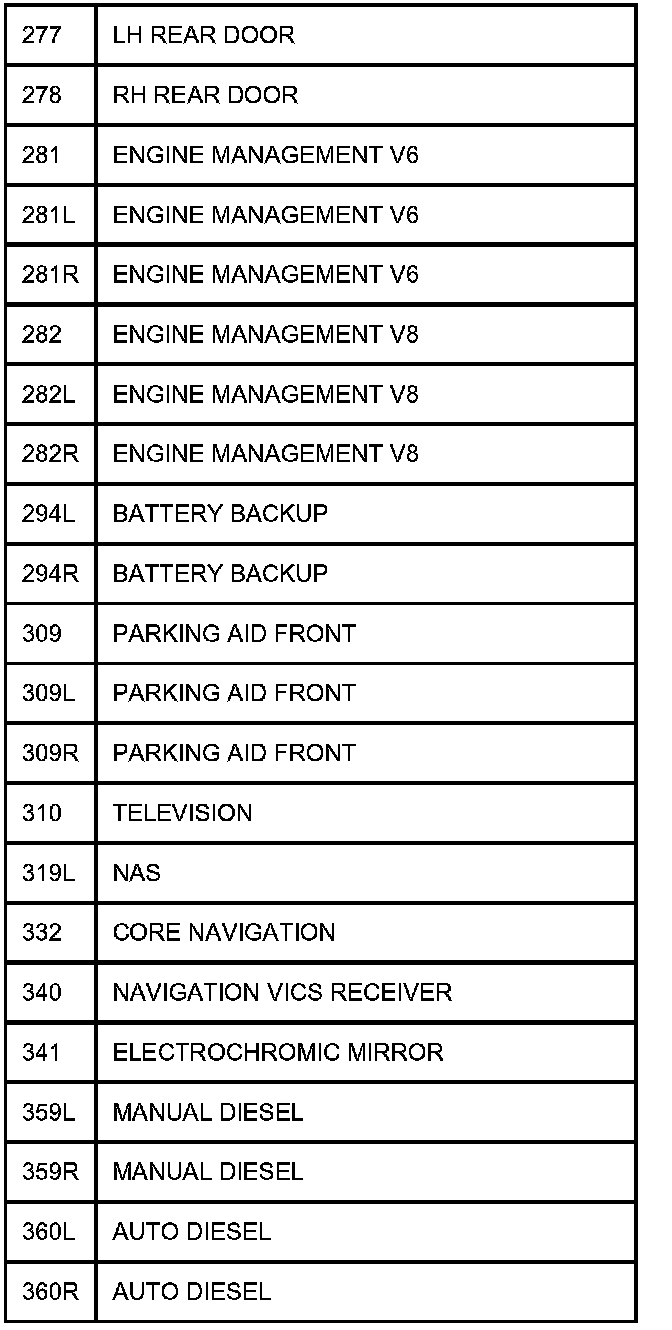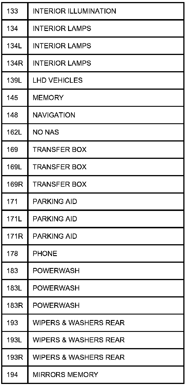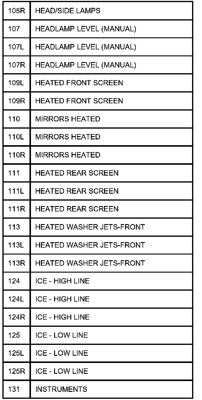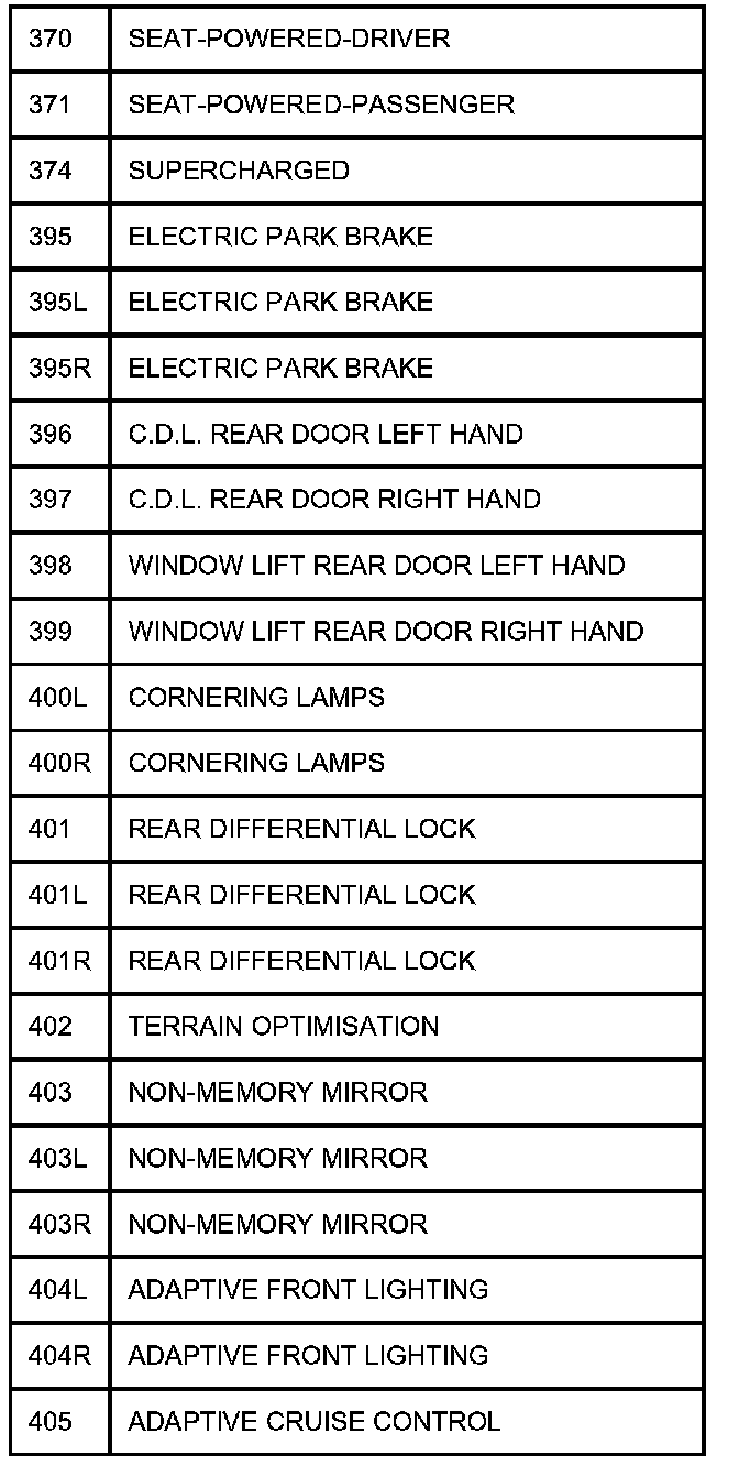 TABLE OF CIRCUIT OPTION CODESThe following table contains a list of circuit (Cct) reference numbers against a description of the applicable model or option. This information should be used in conjunction with the connector pin-out tables to determine the wire configuration of the vehicle under test.