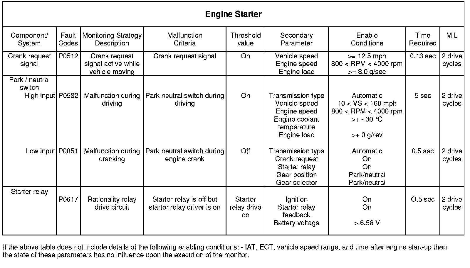 The starter relay is controlled by the ECM in response to a valid crank request signal when the vehicle is stationary and park neutral is selected. A failure of the starter relay circuit will be registered if the starter relay drive signal from the ECM is on but the starter relay feedback indicates that the relay is off.