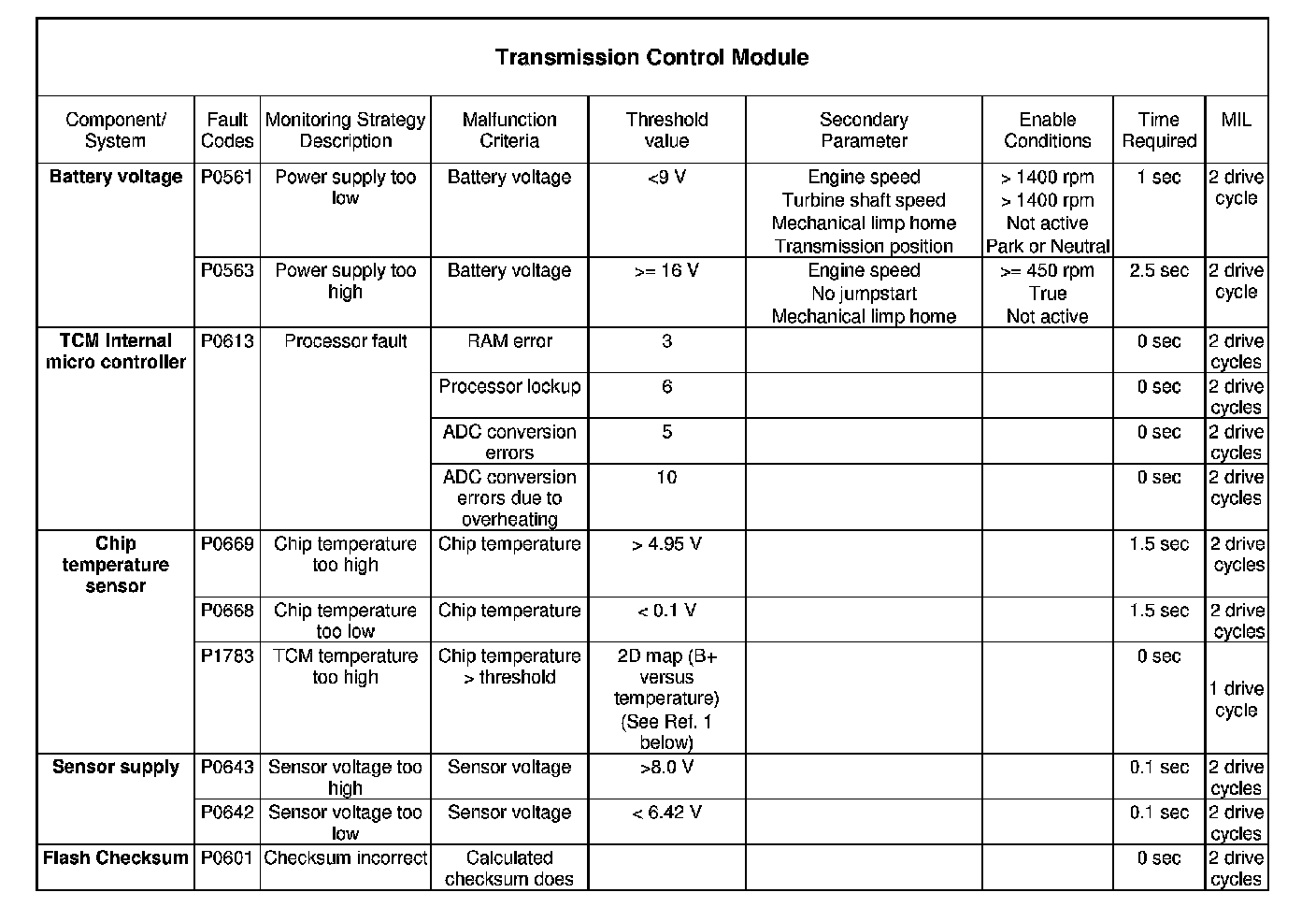 4. The internal TCM chip temperature exceeds a variable temperature threshold depending battery supply voltage. The TCM is situated within the transmission on the valve body. As the TCM controls a number of high power solenoids and is surrounded by transmission fluid it can get very hot. If the temperature of the hardware rises above a pre-determined level, the TCM will be shut down. Prior to the TCM shutting down it will log a fault code, during shutdown the transmission will enter mechanical limp-home mode. A temperature dependent resistor mounted on the processor performs monitoring of the chip temperature.