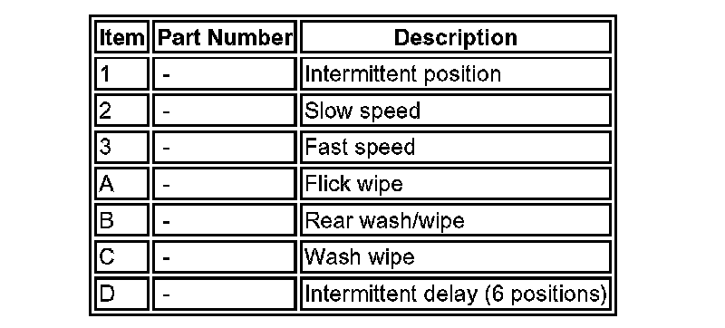 The rear wash/wipe functions are operated by moving the switch rearwards. Rear wipe is selected by moving the wiper switch rearwards to the first detent position. The rear wiper switch is connected between the CJB and ground. When the switch is moved to the rear wiper position the circuit is completed. The CJB detects the completed circuit and operates the rear wiper for as long as the switch contact is made.