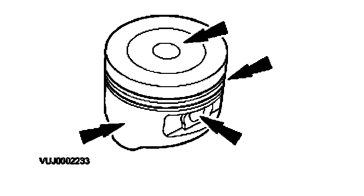 ^ Clean the piston skirt, pin bush, ring grooves and crown and check for wear or cracks.