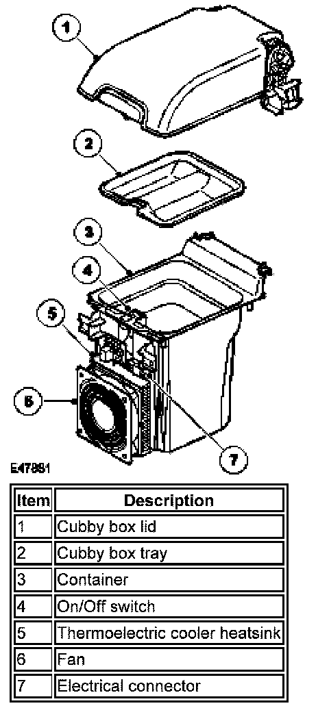 Operation of the thermoelectric cooler is controlled by an on/off switch on the top front edge of the container. A permanent battery feed is supplied to the on/off switch from the central junction box (CJB). A light emitting diode (LED) in the on/off switch is illuminated while the cool box is selected on.