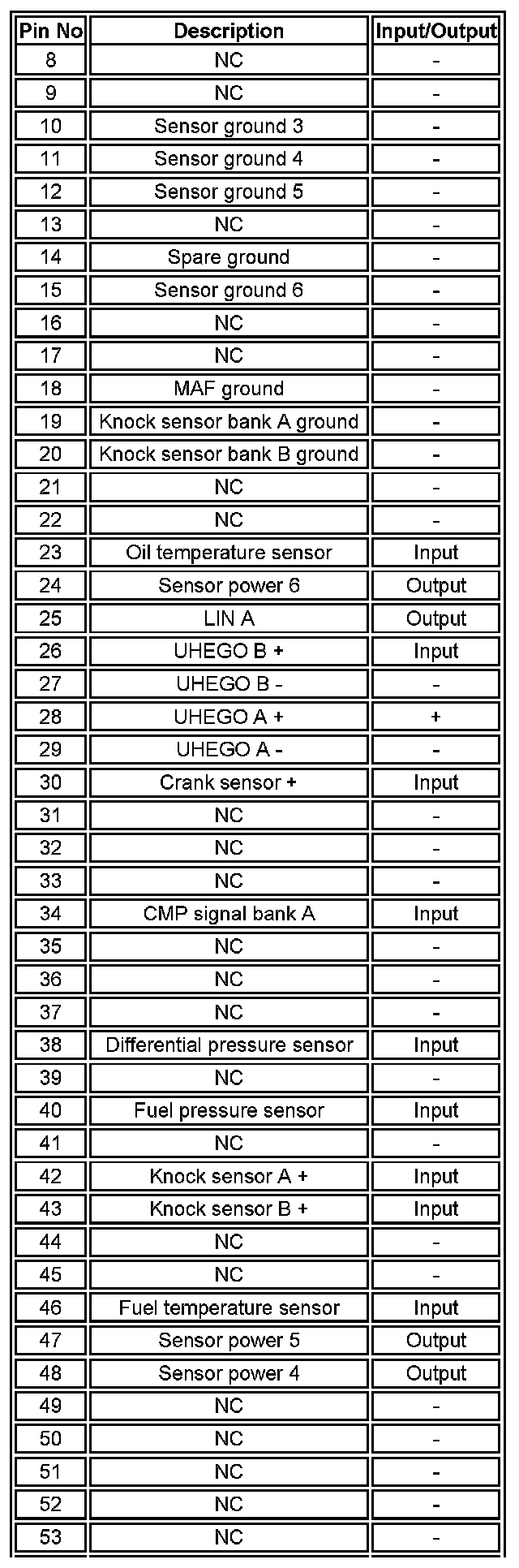 The ECM uses active knock control, which serves to prevent engine damaging pre-ignition or detonation under all operating conditions enabling the engine to operate without additional safety margins. For the ECM to be able to determine the point at which a cylinder is pre-detonating, 2 piezo-ceramic sensors are mounted on the engine block. Each sensor monitors engine knock by converting the engine block noise into a suitable electrical signal, which is then transmitted back to the ECM via a twisted pair cable. The signal is then processed within the ECM to identify the data that characterizes knocking.