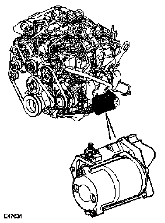 The starter motor is located on the rear LH side of the engine block. The motor is secured to the block and protrudes through an aperture to drive the flywheel via a ring gear.