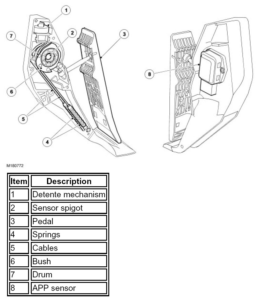 The APP sensor is located in plastic housing which is integral with the throttle pedal. The housing is injection moulded and provides location for the APP sensor. The sensor is mounted externally on the housing and is secured with two Torx screws. The external body of the sensor has a six pin connector which accepts a connector on the vehicle wiring harness.