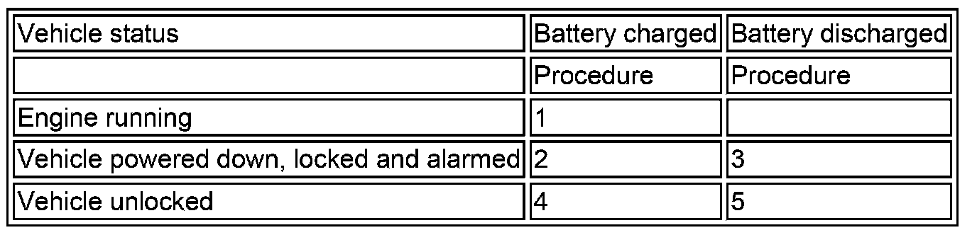 CAUTION: The vehicle status and battery condition must be established before attempting battery disconnect/connect. Reference must be then made to the following table to establish the relevant procedure to be followed.
