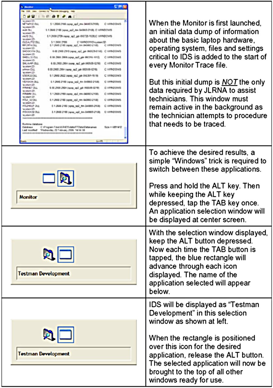 The IDS Monitor Trace application is a powerful data collection tool that enables users to capture details of a failed IDS process. In many cases collecting this data before contacting JLRNA for assistance with a problem vehicle or a possible IDS software error can help expedite a solution by having this detailed info ready to send to JLRNA for review.