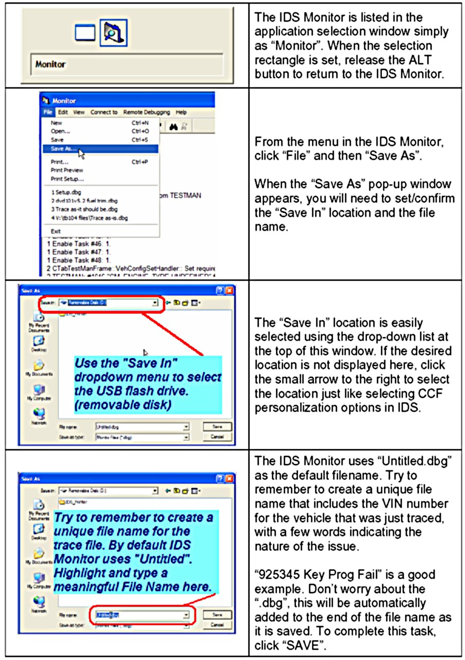 Having an IDS monitor trace file ready when contacting JLRNA can reduce the time technicians must spend on the phone with helpline staff in situations that are not easily resolved. In some cases the problem can only be resolved with the data available from an IDS monitor trace. This is especially true if IDS reports errors during software download/reprogramming of a vehicle's control modules.