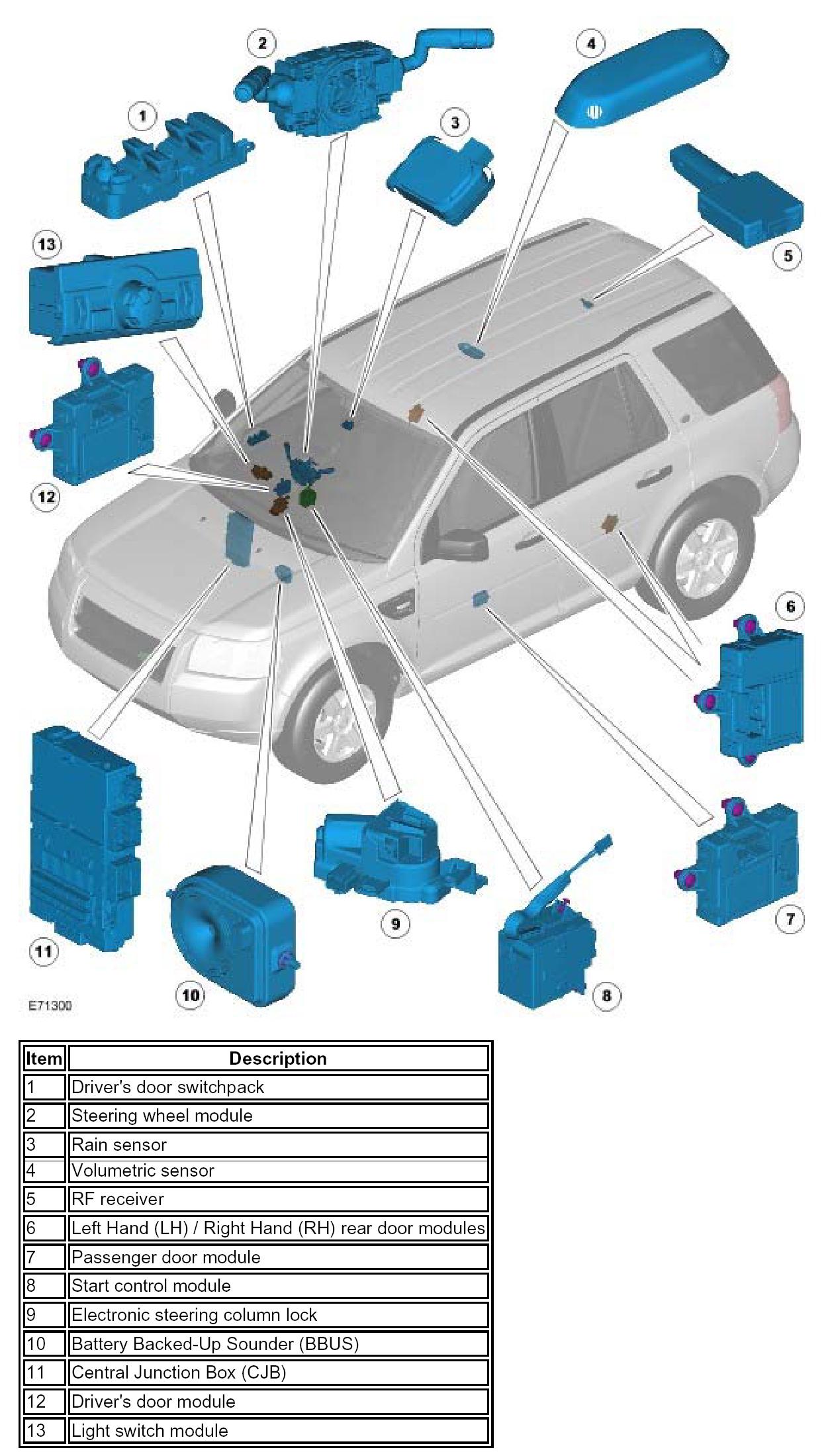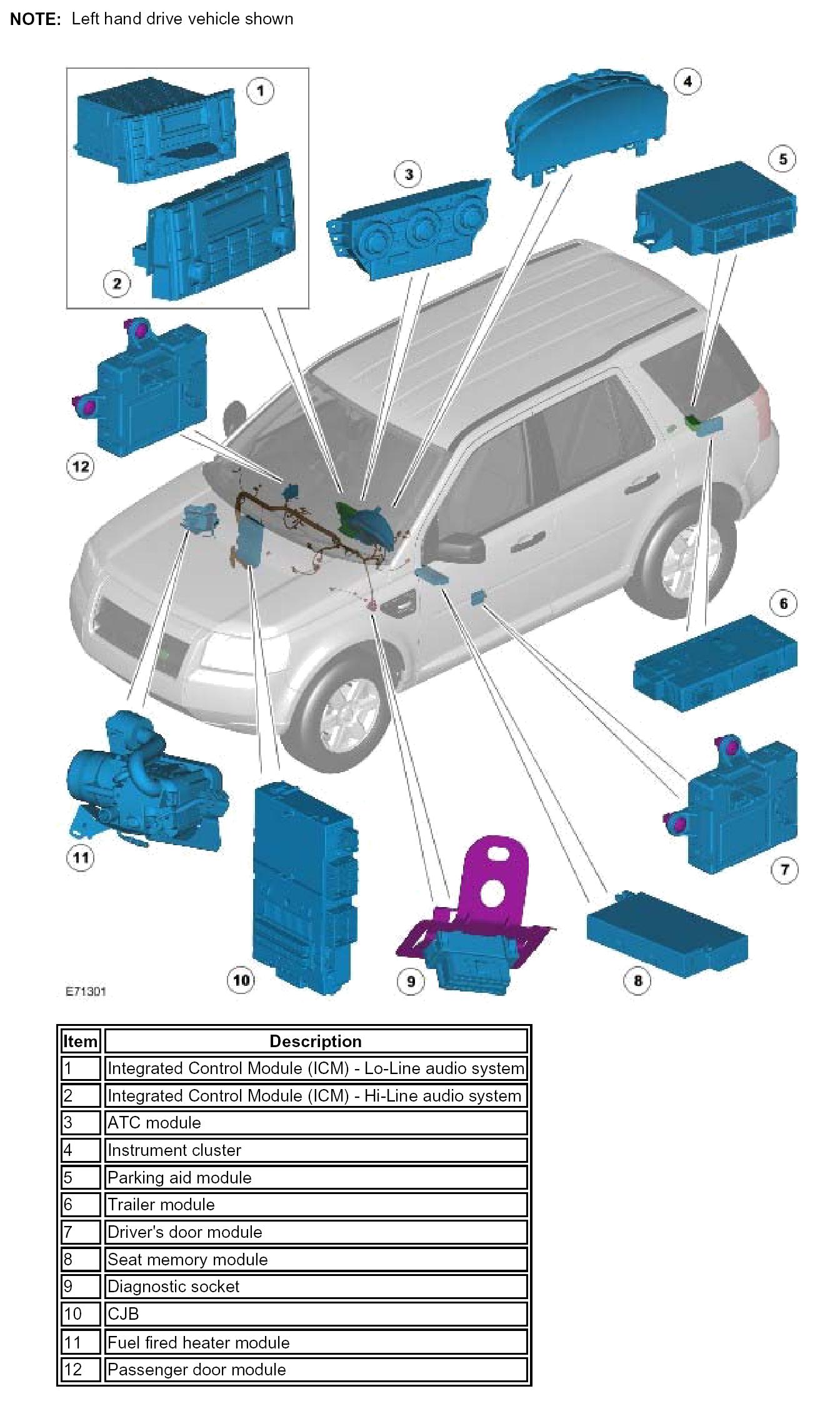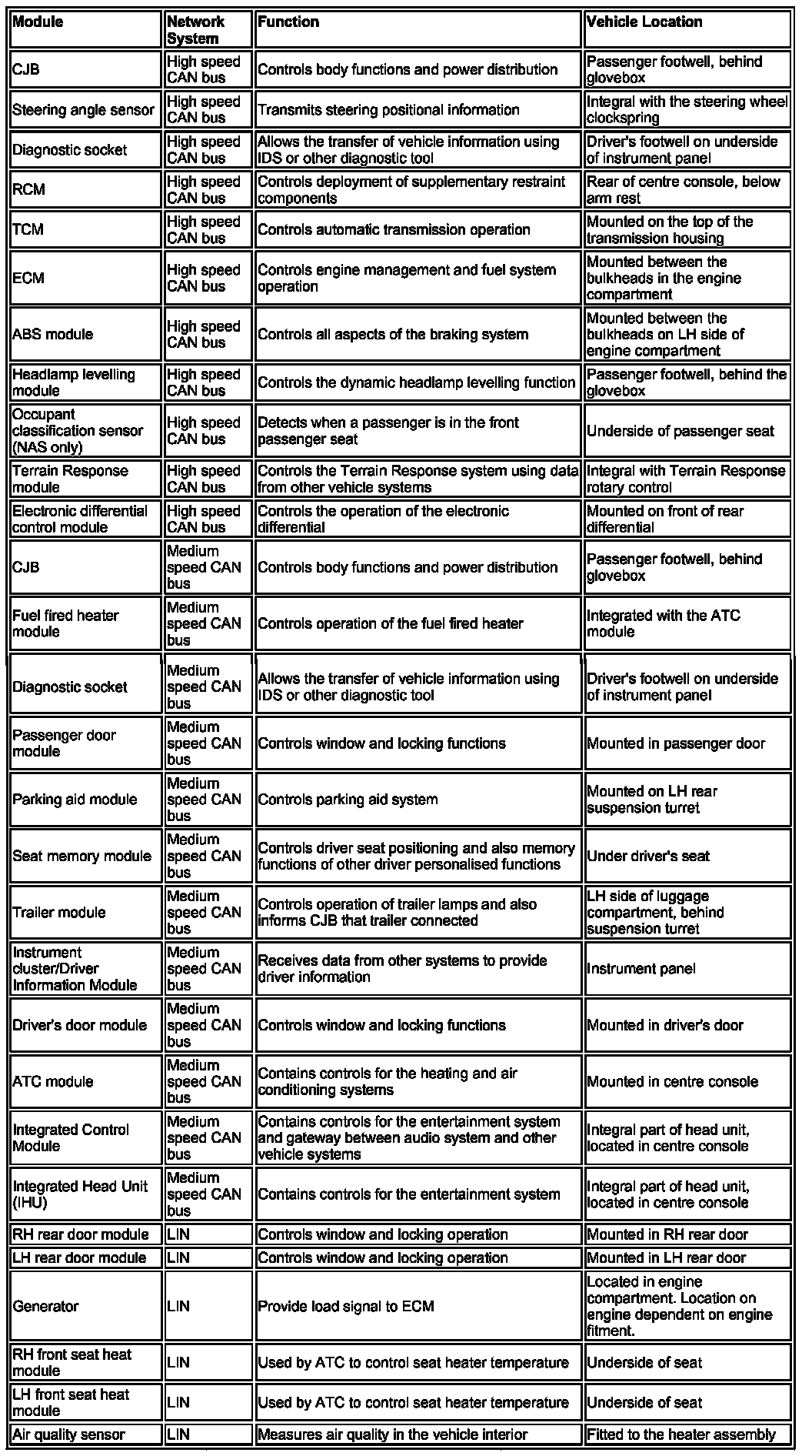 The following table shows each vehicle control module, the network system to which it is connected, its function and location in the vehicle.