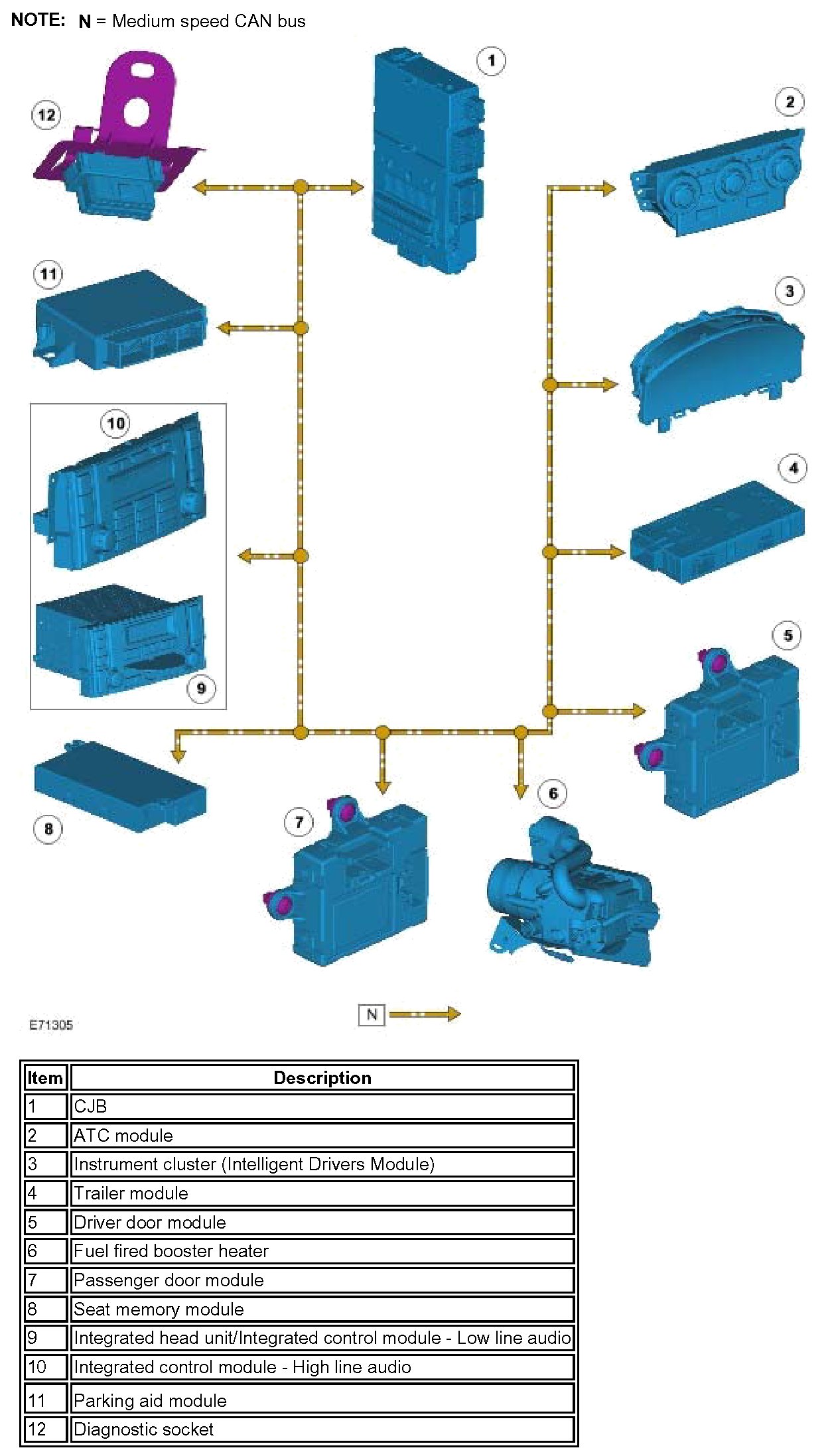 Two CAN bus networks are used on the vehicle; medium speed and high speed, with the Central Junction Box (CJB) acting as a gateway between the 2 networks. The table below shows the wire colors used on both networks.