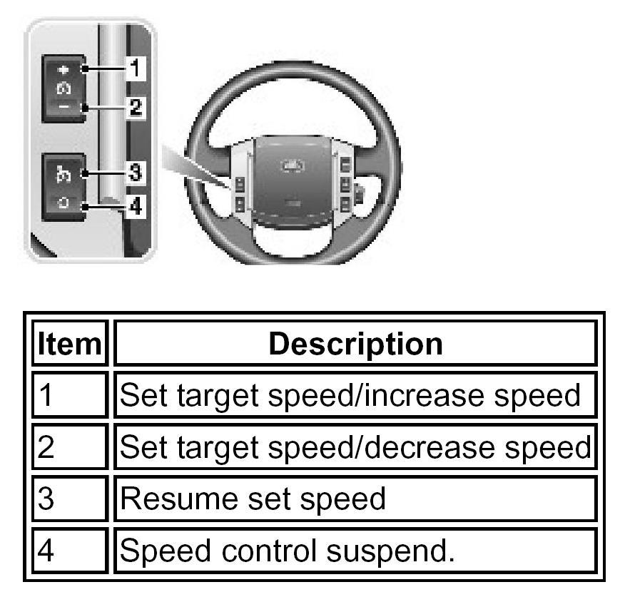 The speed control switches are located on the LH side of the steering wheel. The switches are connected via fly leads directly to the clock spring. All the speed control switches are non-latching momentary rocker switches. The minimum set speed is 18 mph (30 (km/h). Speed control is automatically suspended if the vehicle speed falls below 15 mph (24 km/h).
