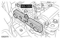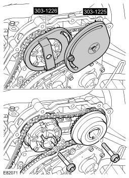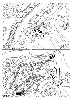 NOTE: Make sure the timing chain free length is on the tensioner run of the chain before releasing the tensioner locking device.